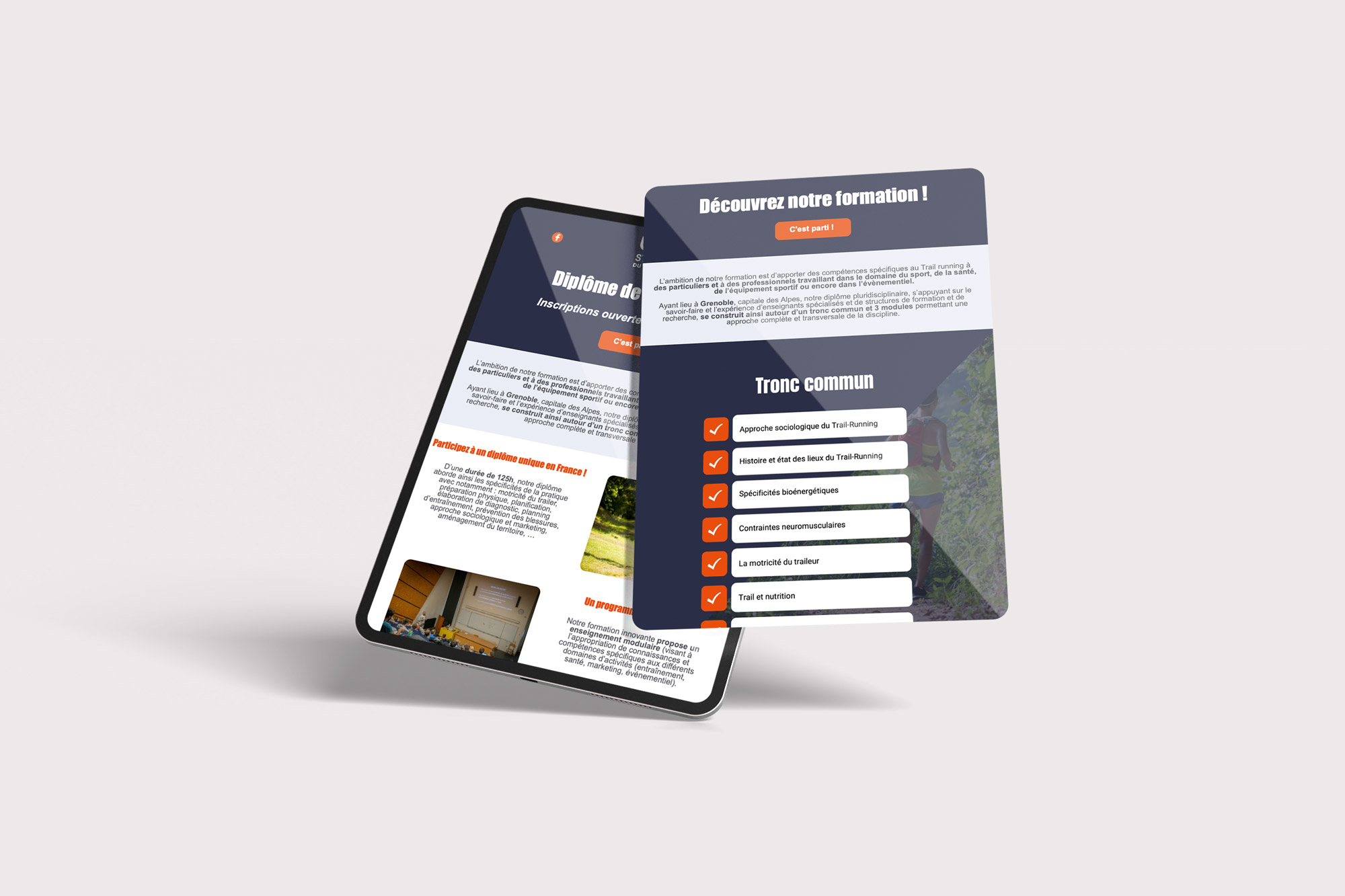 Nous avons développé un site internet optimisé et attrayant pour présenter le diplôme universitaire de Trail-Running. En s'appuyant sur un wireframe (création graphique), nous avons défini le positionnement visuel. Notre stratégie SEO nous a permis d'optimiser le contenu du site pour les moteurs de recherche, garantissant ainsi une meilleure visibilité en ligne et un meilleur classement dans les résultats de recherche sur les mots-clés sélectionnés.